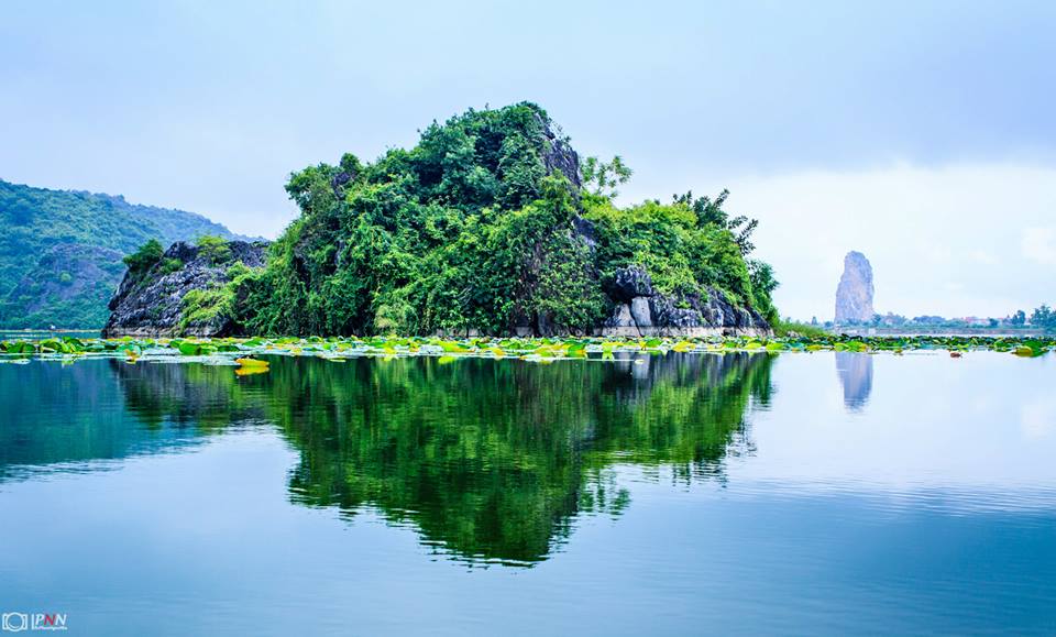 | Hồ Quan Sơn đẹp bởi sự pha quyện giữa những ngọn núi đá vôi lừng lững bên mặt Hồ, trên mặt nước là những thảm thực vật phong phú |