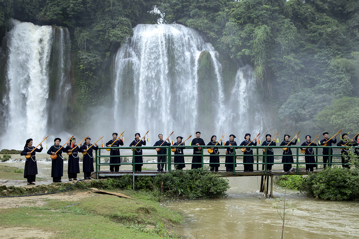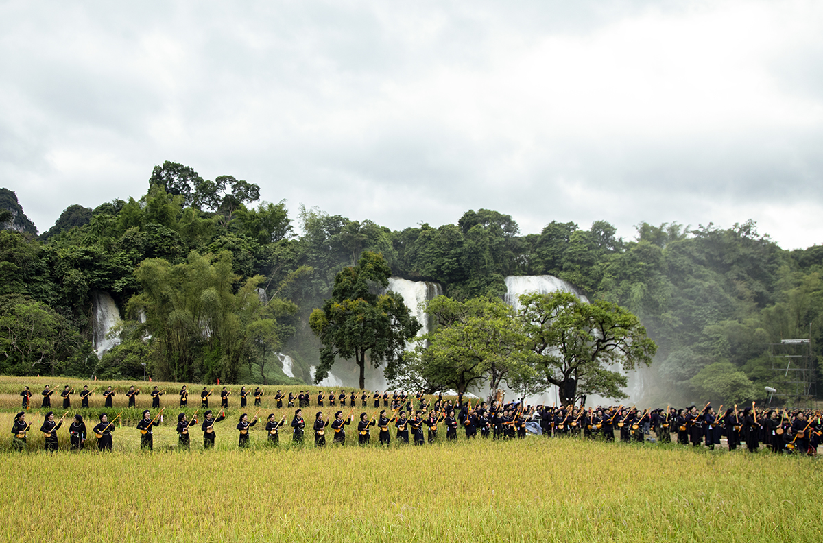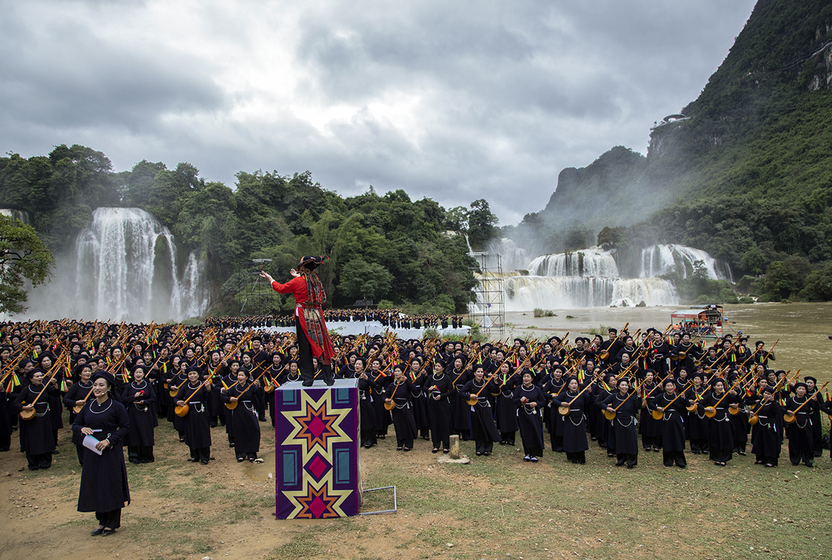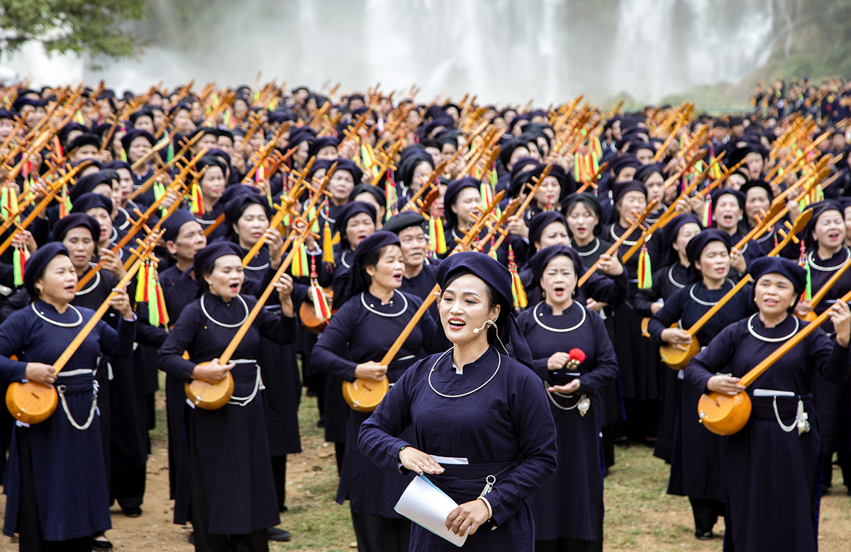 | 1.000 người mặc trang phục truyền thống Tày, Nùng cùng đồng thanh hát Then đàn Tính tạo nên khung cảnh hoành tráng, ấn tượng tại thác Bản Giốc. |