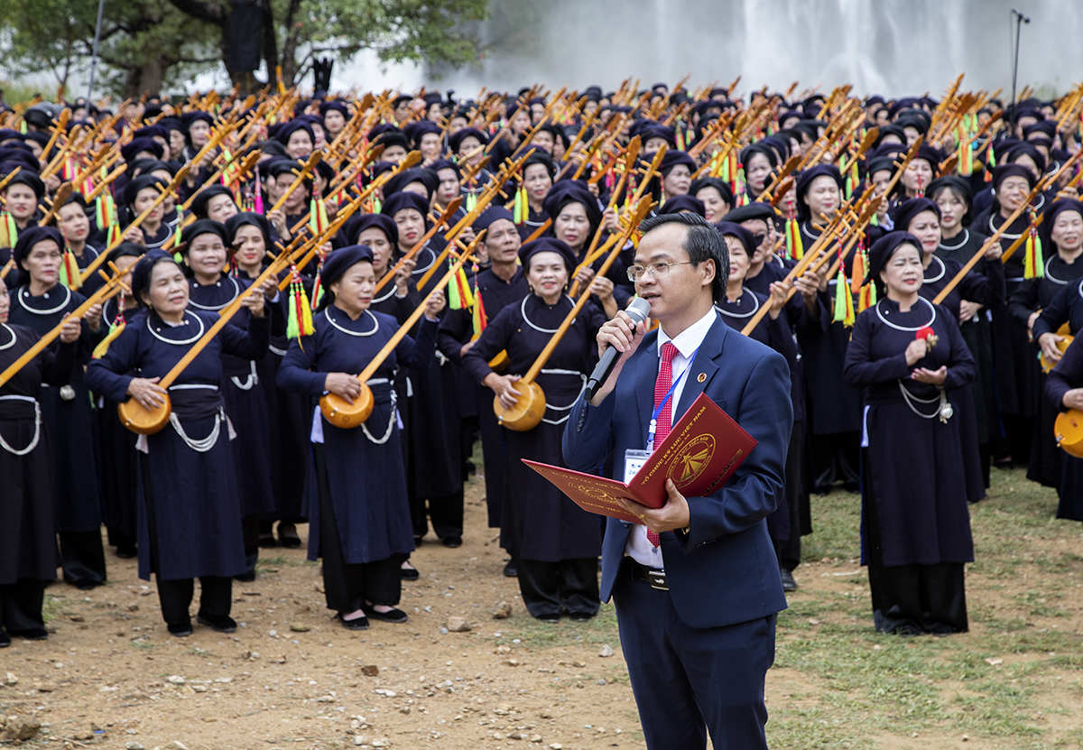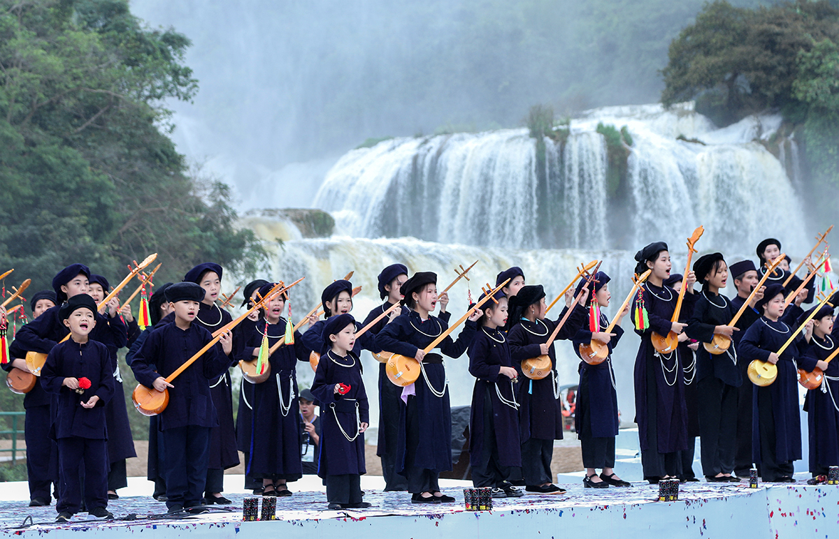 | Màn đồng diễn 1.000 người xác lập kỷ lục hát Then đàn Tính với chủ đề “Cội nguồn và Bản sắc Then Tính Cao Bằng” tại chân thác Bản Giốc. |