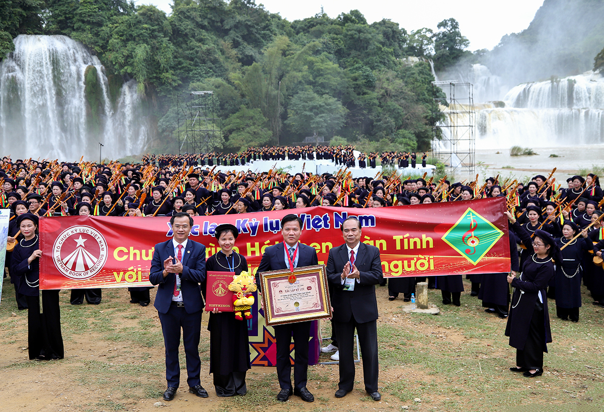 | Đại diện lãnh đạo Hội Kỷ lục gia Việt Nam - Tổ chức Kỷ lục Việt Nam trao “Xác lập kỷ lục màn đồng diễn hát Then đàn Tính có số lượng người tham gia đông nhất Việt Nam” cho lãnh đạo UBND tỉnh Cao Bằng. |