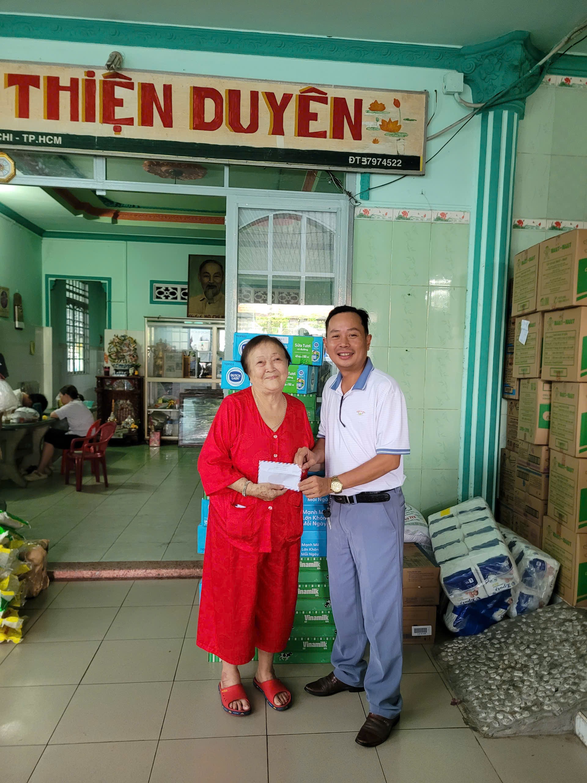 | Anh Trần Xuân Vinh đại diện Ban Quản trị diễn đàn Tennis 4P trao qua cho má Mười. (Ảnh Cảnh Hiếu) |