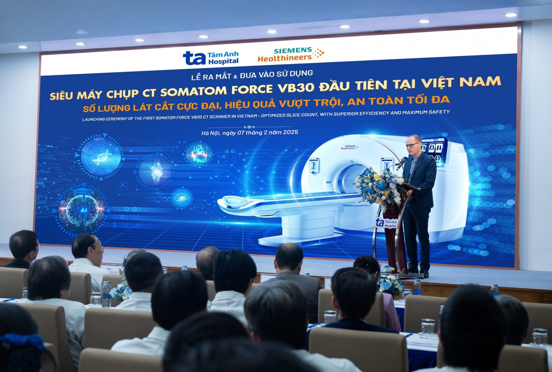 Ông Fabian Martin Singer, Giám đốc Điều hành Siemens Healthineers Việt Nam thông tin máy CT Somatom Force VB30 có thể hỗ trợ các bác sĩ đưa ra chẩn đoán chính xác và nhanh chóng hơn, từ đó giúp tối ưu phác đồ và cải thiện hiệu quả điều trị cho bệnh nhân.