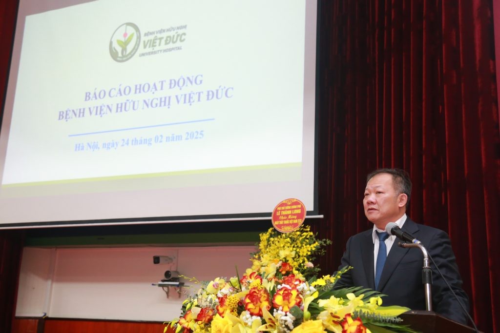 TS.BS Dương Đức Hùng, Giám đốc Bệnh viện Việt Đức, đã trình bày báo cáo tổng quan về hoạt động chuyên môn và những thành tựu nổi bật của bệnh viện. Trải qua gần 120 năm phát triển, bệnh viện đã khẳng định vị thế là một trong những cơ sở y tế hàng đầu Việt Nam, tiên phong trong phẫu thuật và ghép tạng với hơn 2500 nhân viên, hơn 1800 giường bệnh và hơn 50 phòng mổ được trang bị hiện đại, mỗi năm thực hiện khoảng hơn 70.000 ca mổ bao gồm các chuyên ngành sau về ngoại khoa như: phẫu thuật thần kinh, phẫu thuật tim mạch lồng ngực, phẫu thuật gan mật tụy, tiêu hoá, phẫu thuật chấn thương chỉnh hình, cột sống, phẫu thuật thận tiết niệu, phẫu thuật nhi, phẫu thuật tạo hình hàm mặt, vi phẫu, phẫu thuật chuyên sâu các bệnh lý ung thư. Năm 2024, bệnh viện đã thực hiện số lượng ca ghép tạng kỷ lục, bao gồm 234 ca ghép thận, 30 ca ghép gan, 21 ca ghép tim cùng nhiều kỹ thuật phức tạp khác.