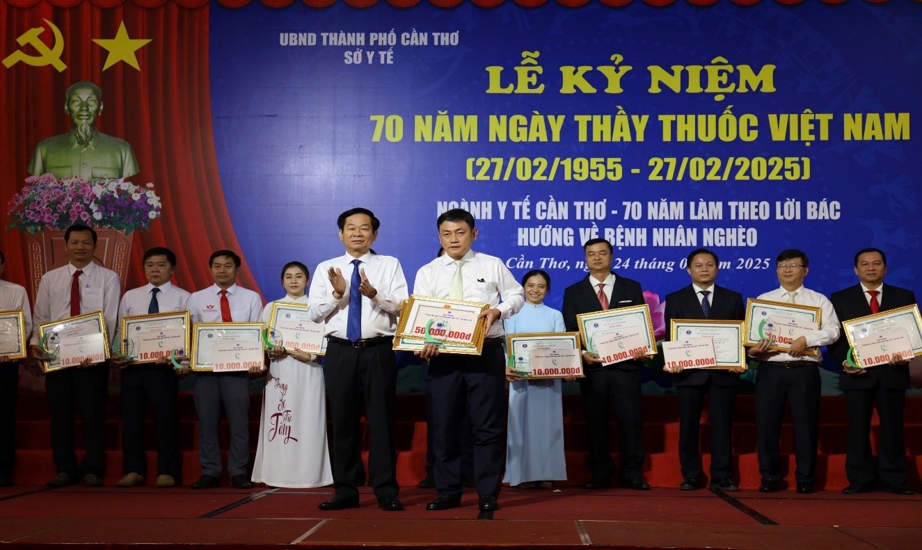 | Ông Nguyễn Thực Hiện, Ủy viên Ban Chấp hành Đảng bộ thành phố, Phó Chủ tịch UBND thành phố Cần Thơ và Phó Giáo sư Tiến sĩ Hoàng Quốc Cường, Giám đốc Sở Y tế trao giải thưởng Thành tựu y khoa. |