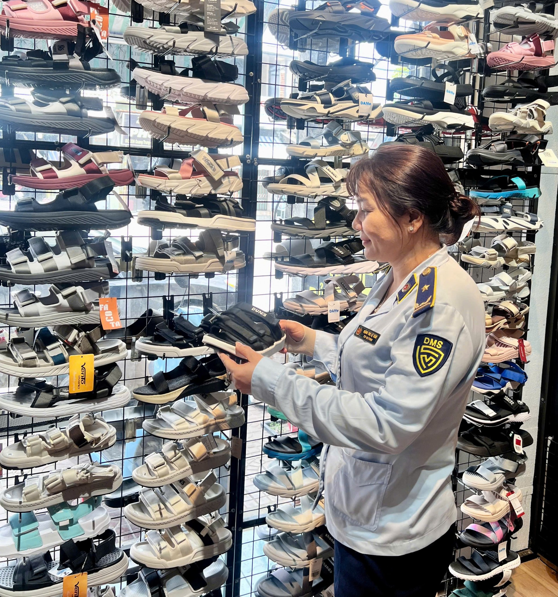 Cũng tại thị trấn Ngô Mây, huyện Phù Cát, lực lượng QLTT kiểm tra Hộ kinh doanh GIÀY…do bà B.T.N làm đại diện. Cơ sở này đang trưng bày để bán 23 đôi giày dép có dấu hiệu giả mạo nhãn hiệu Adidas. Đoàn kiểm tra xác định các sản phẩm trên có dấu hiệu vi phạm quyền sở hữu trí tuệ khi gắn, in, đúc nhãn hiệu trực tiếp lên sản phẩm với kiểu dáng, thiết kế không đồng nhất, không đảm bảo chất lượng, không có bao bì hoặc nhãn phụ. Trị giá hàng hoá vi phạm: 7.400.000 đồng.