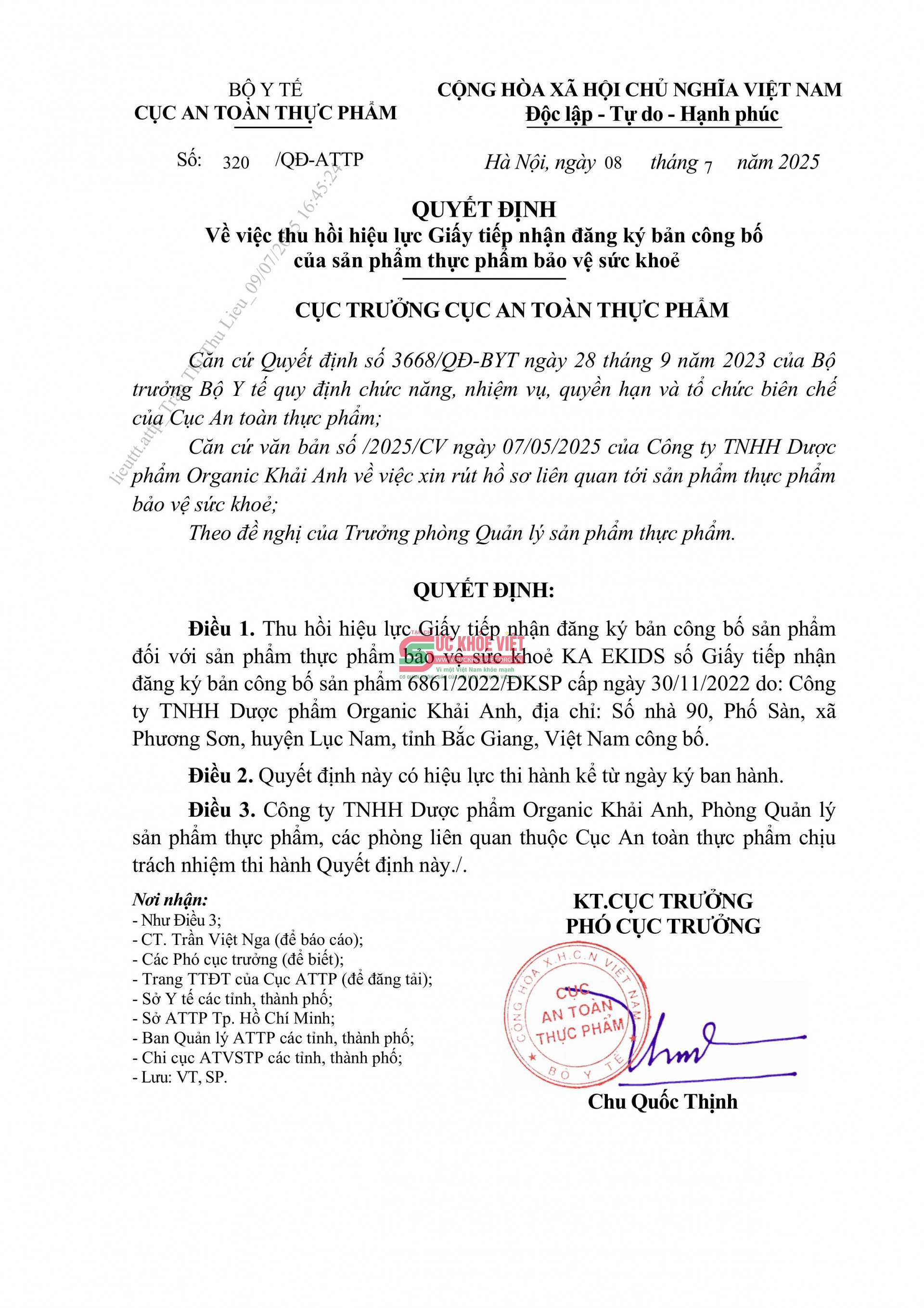 Bộ Y tế thu hồi công bố sản phẩm Siro Ka Ekid của công ty dược phẩm Organic Khải Anh