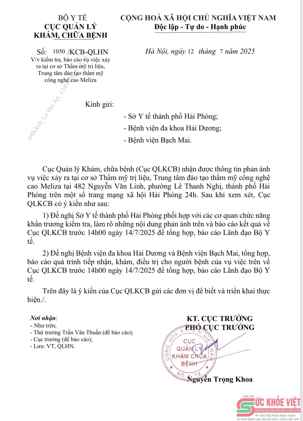 Trước sự nghiêm trọng của sự việc, Cục Quản lý Khám, chữa bệnh yêu cầu Sở Y tế Hải Phòng phối hợp chặt chẽ với các cơ quan chức năng trên địa bàn khẩn trương kiểm tra, xác minh toàn bộ hoạt động của cơ sở MELIZA và báo cáo kết quả về Bộ Y tế trước 14h ngày 14/7/2025.