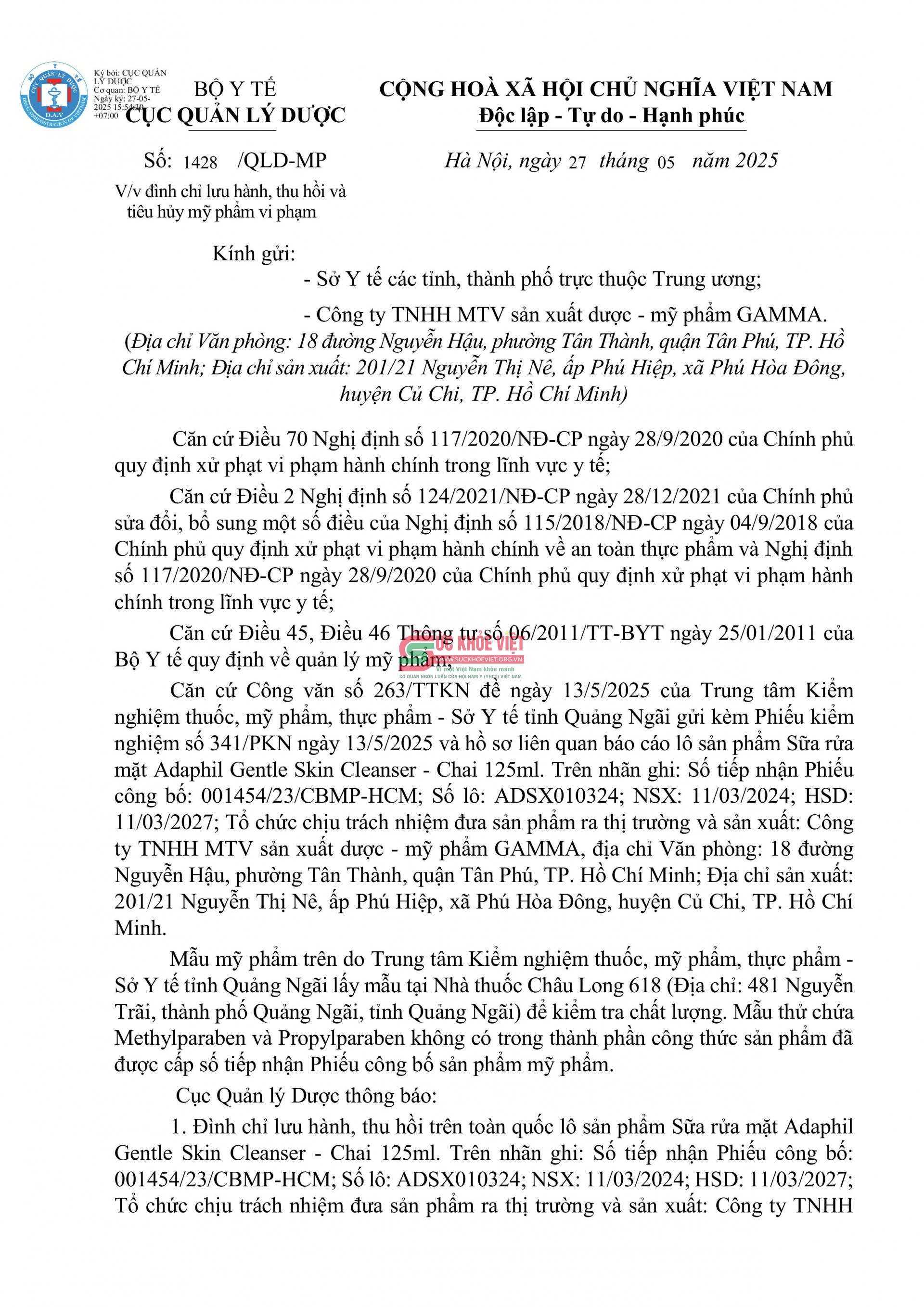 Theo văn bản số 263/TTKN ngày 13/5/2025 của Trung tâm Kiểm nghiệm thuốc, mỹ phẩm (Sở Y tế Quảng Ngãi), mẫu Sữa rửa mặt Adaphil Gentle Skin Cleanser (chai 125ml), lô ADSX010324, hạn sử dụng đến 11/03/2027, bị phát hiện chứa Methylparaben và Propylparaben – dù hai chất này không được liệt kê trong hồ sơ công bố sản phẩm (số tiếp nhận: 001454/23/CBMP-HCM).