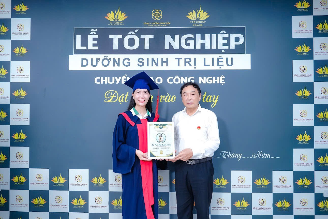| TTND.GS.TS Trương Việt Bình - Chủ tịch Hội Nam Y Việt Nam trao chứng nhận tốt nghiệp khóa học Dưỡng sinh trị liệu cho học viên Trần Thị Huyền Trang. |