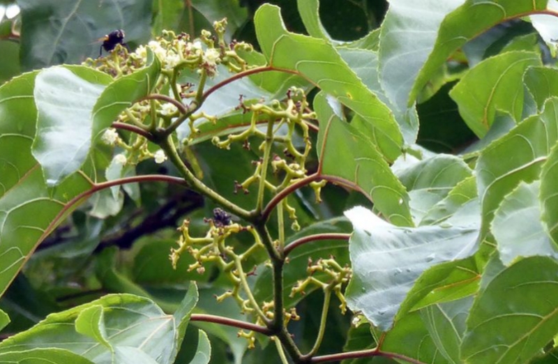 Hoa cây có màu trắng xanh, mọc thành chùm. Bông hoa nhỏ có 5 cánh xếp đều như hình ngôi sao;
