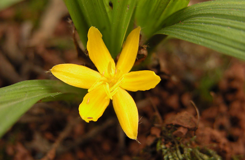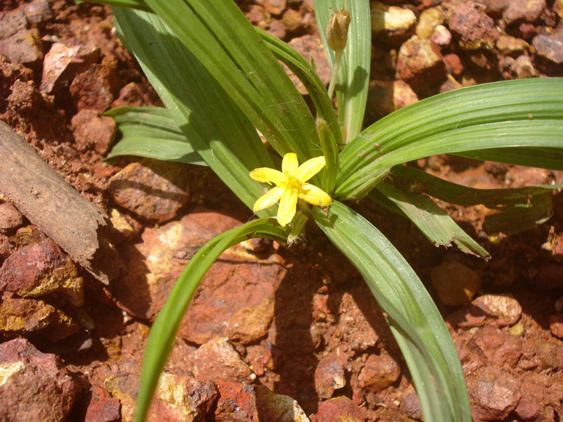 Cụm hoa mọc trên một cán ngắn ở phần kẽ lá, mang từ 3 đến 5 hoa có màu vàng, lá bắc có hình trái xoan, đài hoa 3 răng có lông; tràng hoa 3 cánh nhẵn; có nhị 6, xếp thành hai dãy, chỉ nhị hoa ngắn; bầu hoa hình thoi, có lông.