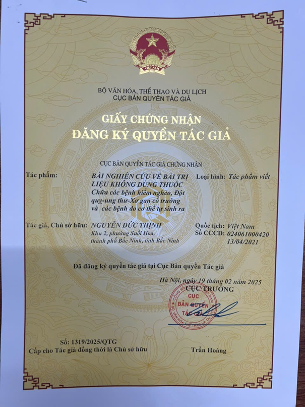 Không chỉ dừng lại ở việc hỗ trợ trực tiếp cho những bệnh nhân xung quanh, ông Thịnh còn quyết định chia sẻ rộng rãi phương pháp của mình với cộng đồng. Ông đã đăng ký bản quyền tác giả, không chỉ để bảo vệ sáng chế của mình mà còn để có thể lan tỏa thông điệp về khả năng tự chữa lành của con người. Ông mong muốn phương pháp này sẽ là một con đường mới cho những ai đang mắc phải các bệnh hiểm nghèo, một con đường không phụ thuộc vào thuốc men hay phẫu thuật, mà vào chính sức mạnh tiềm ẩn trong cơ thể.