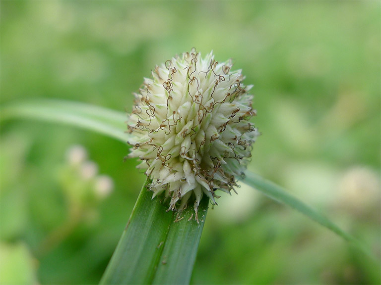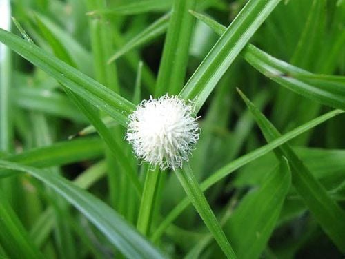 - Hoa cỏ bạc đầu mọc thành cụm hình cầu ở ngọn, đường kính khoảng 8-12mm trên một cán dài ba cạnh, mỗi cụm bao gồm 1 đến 3 bông hình trụ. Hoa màu trắng, mang 3 đến 4 lá bắc dài, nằm ngang. Mỗi bông nhỏ trong cụm thường chứa một hoa riêng, ở trên có vảy nhẵn, hơi nhám, ở dưới có lông tơ mịn. Nhị hoa thuộc dạng nhị 3-2;