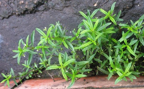 Cây thảo mọc bò, dài 20 – 25cm, thân vuông màu nâu nhạt, cành lá sum sê. Lá cây mọc đối, hình mác thuôn, dài 1 – 3,5cm, rộng 1 – 3cm, gốc và đầu lá nhọn, mặt trên nhẵn hoặc hơi nháp, mặt dưới có màu xám nhạt, gân giữa nổi rõ, các lá kèm có răng nhỏ ở đầu.