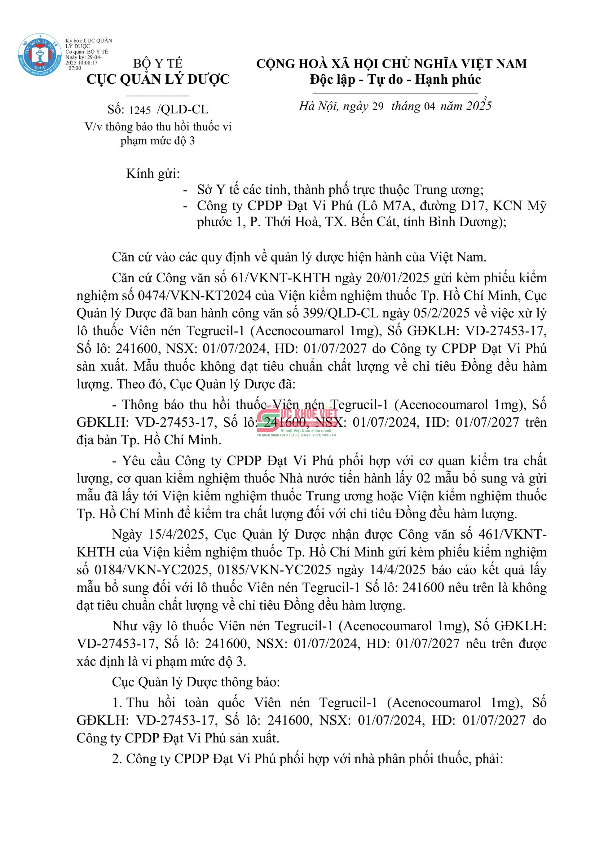 Công văn số 1245/QLD-CL của Cục Quản lý Dược về việc thu hồi lô thuốc viên nén Tegrucil-1.