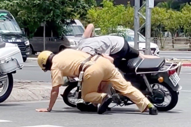 Đại úy CSGT đã vật ngã người đàn ông trên xuống đường và nhờ tổ tuần tra, kiểm soát đến hỗ trợ làm việc. Người vi phạm trình bày với tổ tuần tra là gia đình có việc nên không làm chủ được bản thân, mất bình tĩnh dẫn đến việc không để ý biển báo.