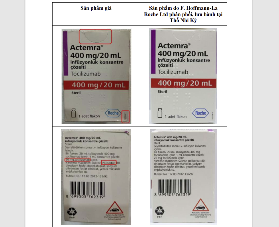 Mẫu sản phẩm nghi ngờ là thuốc giả do khách hàng cung cấp (được mua từ website: https://alomuathuoc.vn/san-pham/thuoc-actemra-400mg-20ml-gia/), đã được Công ty F. Hoffmann-La Roche Ltd so sánh, đối chiếu và xác nhận có các dấu hiệu khác biệt so với mẫu lô thuốc ActemraÒ 400 mg/20 mL, số lô B2101B32 do Công ty F. Hoffmann-La Roche Ltd phân phối và chỉ lưu hành tại Thổ Nhĩ Kỳ.