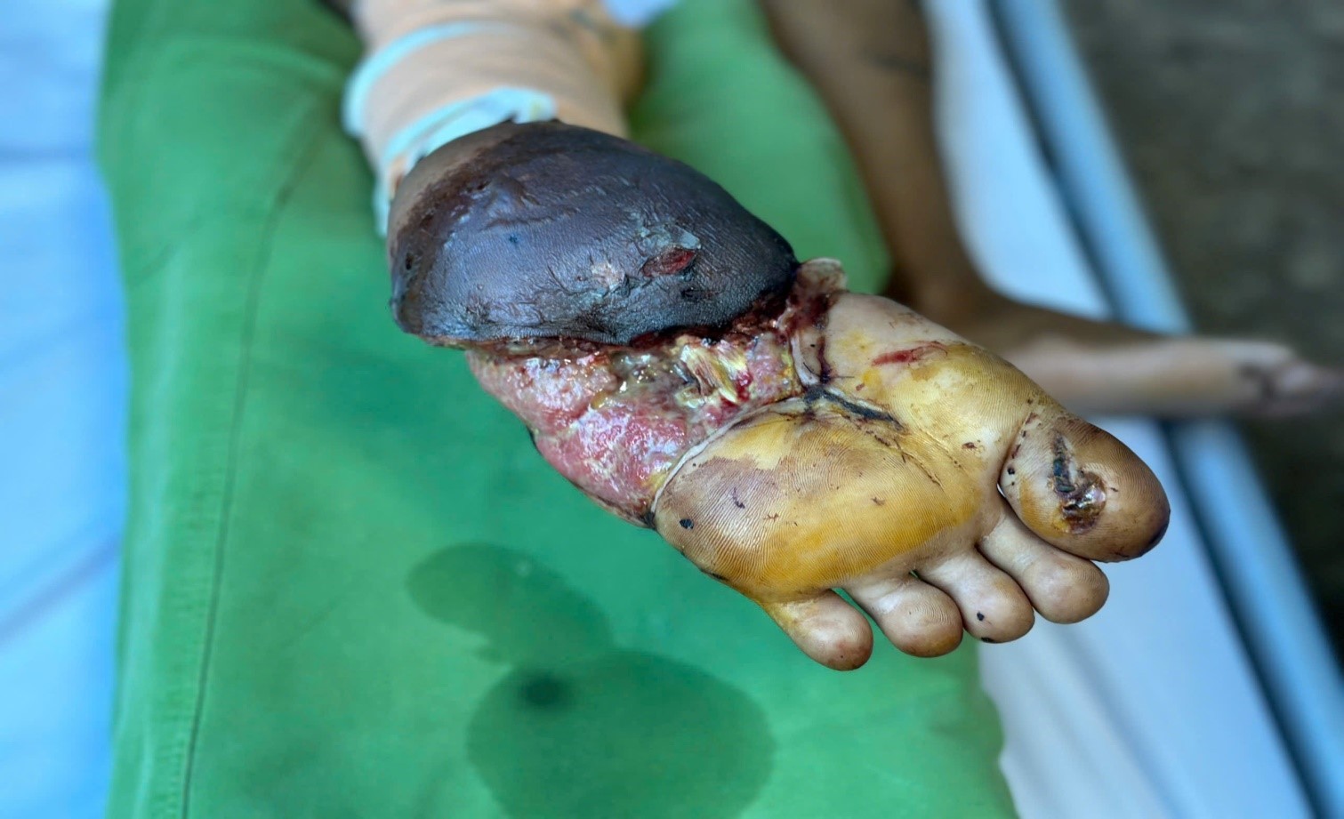 Vào ngày 14 tháng 6 năm 2025, anh K. S. nhập viện trong tình trạng nguy kịch sau một tai nạn lao động nghiêm trọng. Trong lúc làm việc, anh không may bị gỗ đè, gây dập nát nghiêm trọng vùng gót và da lòng bàn chân, đồng thời gãy hở xương gót và xương ghe.