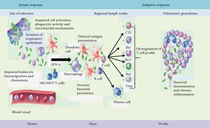 Nhiễm Mycobacterium tuberculosis (MTB) ban đầu vào đại thực bào phế nang (AM) qua việc hít phải vi khuẩn sẽ kích hoạt phản ứng miễn dịch bẩm sinh, thu hút nhiều loại tế bào myeloid vào phế nang. Các đại thực bào phế nang đóng vai trò trung tâm trong việc nhiễm và tái tạo MTB. Những đại thực bào này sẽ nuốt vi khuẩn và bao quanh chúng trong các phagosome, kết hợp với lysosome để tiêu hóa vi khuẩn và sản xuất các phân tử kháng khuẩn như các intermediates nitơ phản ứng. Chúng cũng có vai trò thiết yếu trong việc hình thành granulomas, đặc trưng của lao ở người, chứa các tế bào miễn dịch khác như tế bào bạch cầu trung tính và tế bào T.