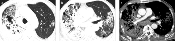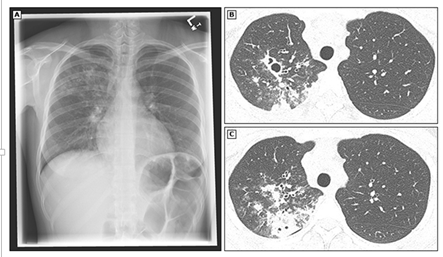- (B và C) Hình ảnh cắt lớp vi tính (CT) cho thấy hai hang cạnh nhau, các đám mờ không rõ ranh giới, và vùng đông đặc có hang ở thùy trên phổi phải.