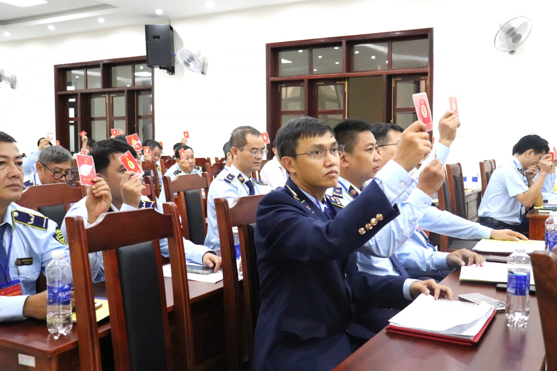 Cũng trong khuôn khổ chương trình làm việc, Đại hội đã biểu quyết thống nhất thông qua Nghị quyết của Đại hội Đảng bộ bộ phận Chi cục Quản lý thị trường lần thứ I, nhiệm kỳ 2025 - 2030 với 08 chỉ tiêu cụ thể: 1. Phấn đấu 100% đảng viên và ít nhất 95% quần chúng tham gia đầy đủ các lớp học tập, quán triệt nghị quyết, chỉ thị, chính sách của Đảng, pháp luật Nhà nước theo kế hoạch của cấp trên. 2. 100% chi bộ trực thuộc duy trì sinh hoạt định kỳ đúng quy định, đảm bảo chất lượng. 3. Hàng năm, 100% đảng viên xây dựng bản cam kết và thực hiện nghiêm túc việc học tập và làm theo tư tưởng, đạo đức, phong cách Hồ Chí Minh. 4. Đánh giá xếp loại đảng viên hàng năm có từ 85% đảng viên hoàn thành tốt nhiệm vụ trở lên, trong số đảng viên hoàn thành tốt nhiệm vụ có ít nhất 15% hoàn thành xuất sắc nhiệm vụ. 5. Đảng bộ bộ phận phấn đấu hàng năm được xếp loại “Hoàn thành tốt nhiệm vụ” trở lên. 6. Trong nhiệm kỳ, phấn đấu giới thiệu kết nạp từ 04 đảng viên mới trở lên, đảm bảo tiêu chuẩn, quy trình, chất lượng. 7. Hằng năm, các Chi bộ thực hiện kiểm tra ít nhất 30% đảng viên; đảm bảo 100% đảng viên được kiểm tra, giám sát ít nhất 1 lần trong nhiệm kỳ. 8. Phấn đấu hàng năm có trên 95% công chức hoàn thành tốt nhiệm vụ chính trị của cơ quan; trên 85% đạt danh hiệu lao động tiên tiến. 100% công chức, người lao động thực hiện tốt quy chế dân chủ ở cơ sở và nội quy, quy định của đơn vị.