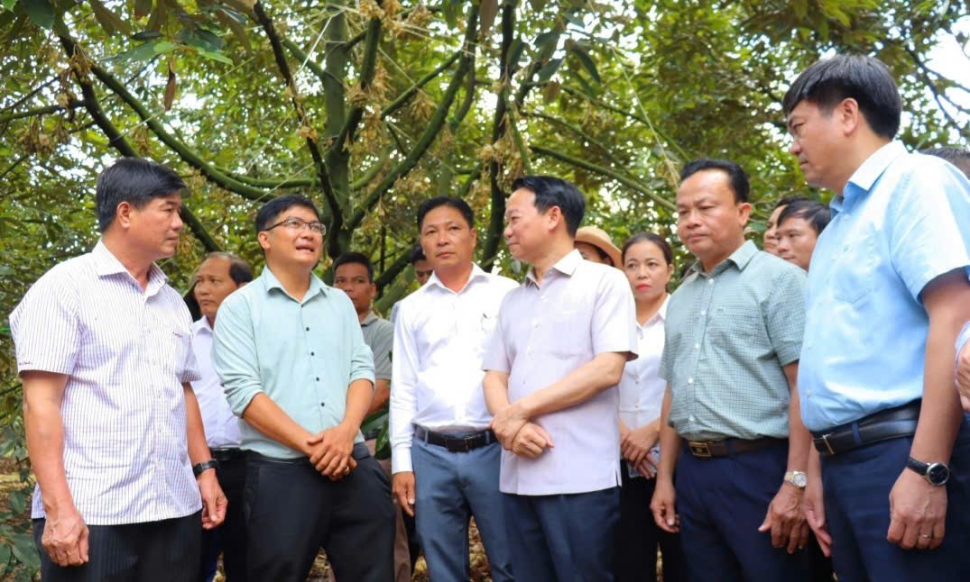 | Bộ trưởng Bộ Nông nghiệp và Môi trường Đỗ Đức Duy cùng đoàn công tác đi thực địa vùng trồng sầu riêng tại huyện Krông Pắc. |