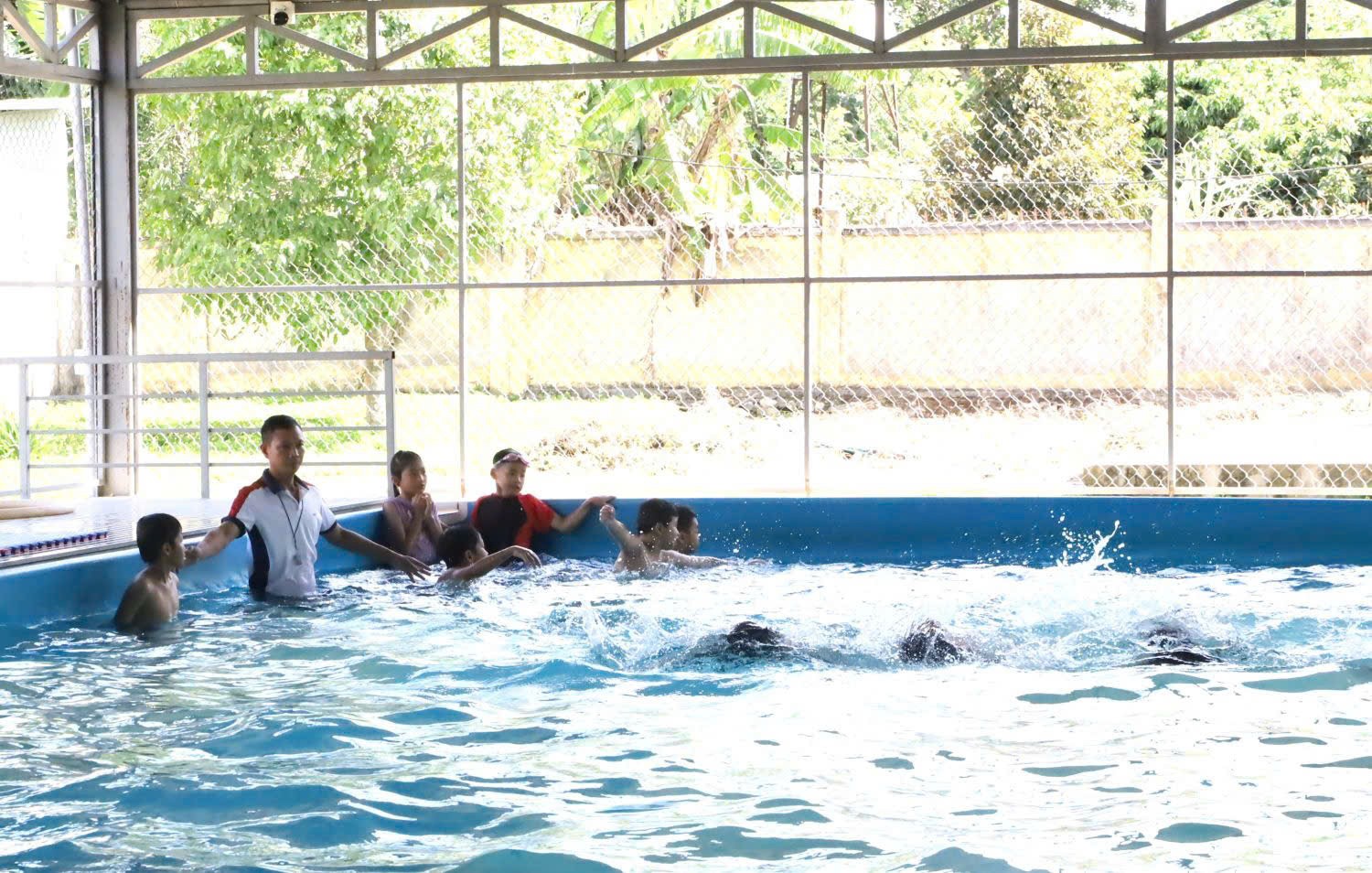 | Các học sinh tham gia học bơi sau lễ phát động. |