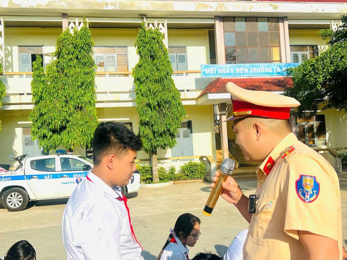 | Cán bộ Đội Cảnh sát giao thông tuyên truyền, phổ biến pháp luật về giao trật tự an toàn giao thông cho các em học sinh trường THCS Ea Tiêu (xã Ea Tiêu). |