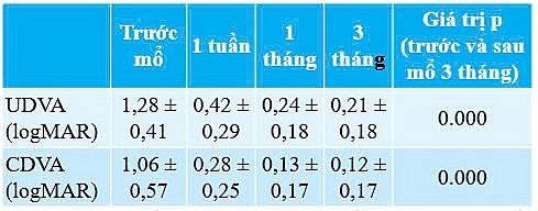 Nghiên cứu của chúng tôi ghi nhận độ loạn thị giác mạc sau phẫu thuật 1 tháng giảm có ý nghĩa thống kê so với trước phẫu thuật từ 1,52 ± 0,59 giảm xuống còn 0,66 ± 0,44 (p < 0.001).Sau phẫu thuật, thị lực chưa chỉnh kính (UDVA) và sau chỉnh kính (CDVA) của các bệnh nhân trong nhóm nghiên cứu cải thiện có ý nghĩa thống kê, lần lượt là 1,28 ± 0,41 và 1,06 ± 0,57 xuống còn 0,21 ± 0,18 và 0,12 ± 0,17 (với p < 0,05). Ngoài ra, tất cả các bệnh nhân đều có UDVA thời điểm 3 tháng tốt hơn CDVA trước phẫu thuật.