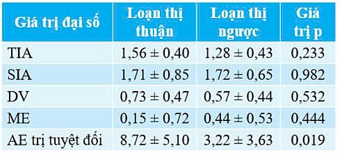 Trong nhóm loạn thị ngược qua các thời điểm, SIA có xu hướng tăng dần từ thời điểm 1 tuần (1,47 ± 1,02) đến thời điểm 3 tháng (1,72 ±0,65) nhưng khác biệt không có ý nghĩa thống kê với p = 0,622. Tương ứng, DV có xu hướng giảm liên tục qua các thời điểm từ 1 tuần (1,19 ± 0,50) xuống đến 3 tháng (0,57 ± 0,44) với các p < 0,05 (so sánh giữa các thời điểm). Ngoài ra, ME và CI cho thấy nhóm loạn thị ngược có sự thặng chỉnh (ME > 0, CI > 0) tăng liên tục thời điểm 3 tháng. Mặt khác, kết quả AE trị tuyệt đối thời điểm 1 tuần cao bất thường được quy cho 3 bệnh nhân trong nhóm này còn phù giác mạc đáng kể sau phẫu thuật. Các trường hợp trên được cho thuốc và đáp ứng tốt, giác mạc trong trở lại và AE trị tuyệt đối giảm có ý nghĩa thống kê từ 1 tuần đến 1 tháng với p = 0,010 và kết quả ổn định từ 1 tháng (3,21 ± 4,44) đến 3 tháng (3,22 ± 3,63) với p = 0,229.