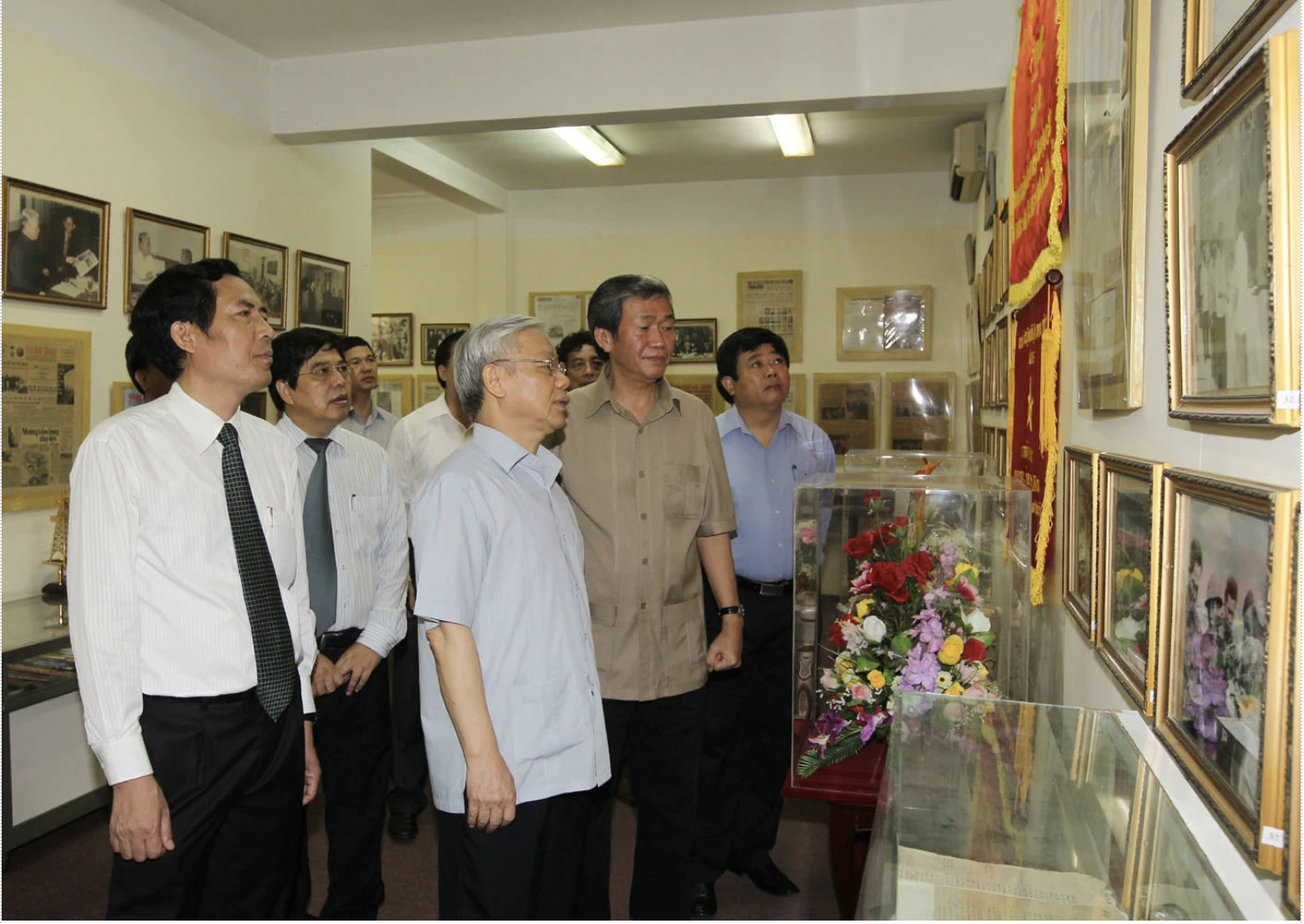 | Đồng chí Đinh Thế Huynh tháp tùng Tổng Bí thư Nguyễn Phú Trọng thăm phòng truyền thống của Báo Nhân Dân. Ảnh : Trí Dũng – TTXVN |