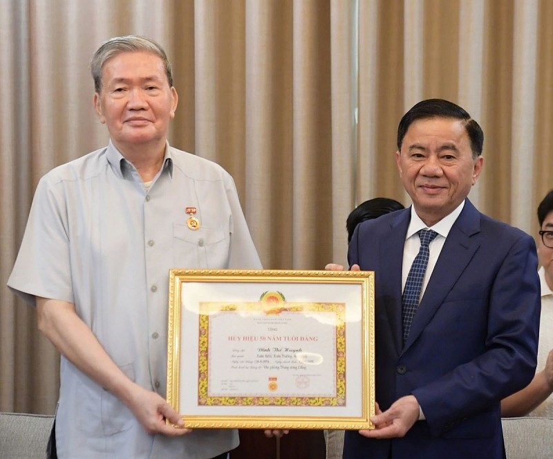| Thường trực Ban Bí thư, Chủ nhiệm Ủy ban Kiểm tra Trung ương Trần Cẩm Tú trao Huy hiệu 50 năm tuổi đảng tặng nhà báo Đinh Thế Huynh. |