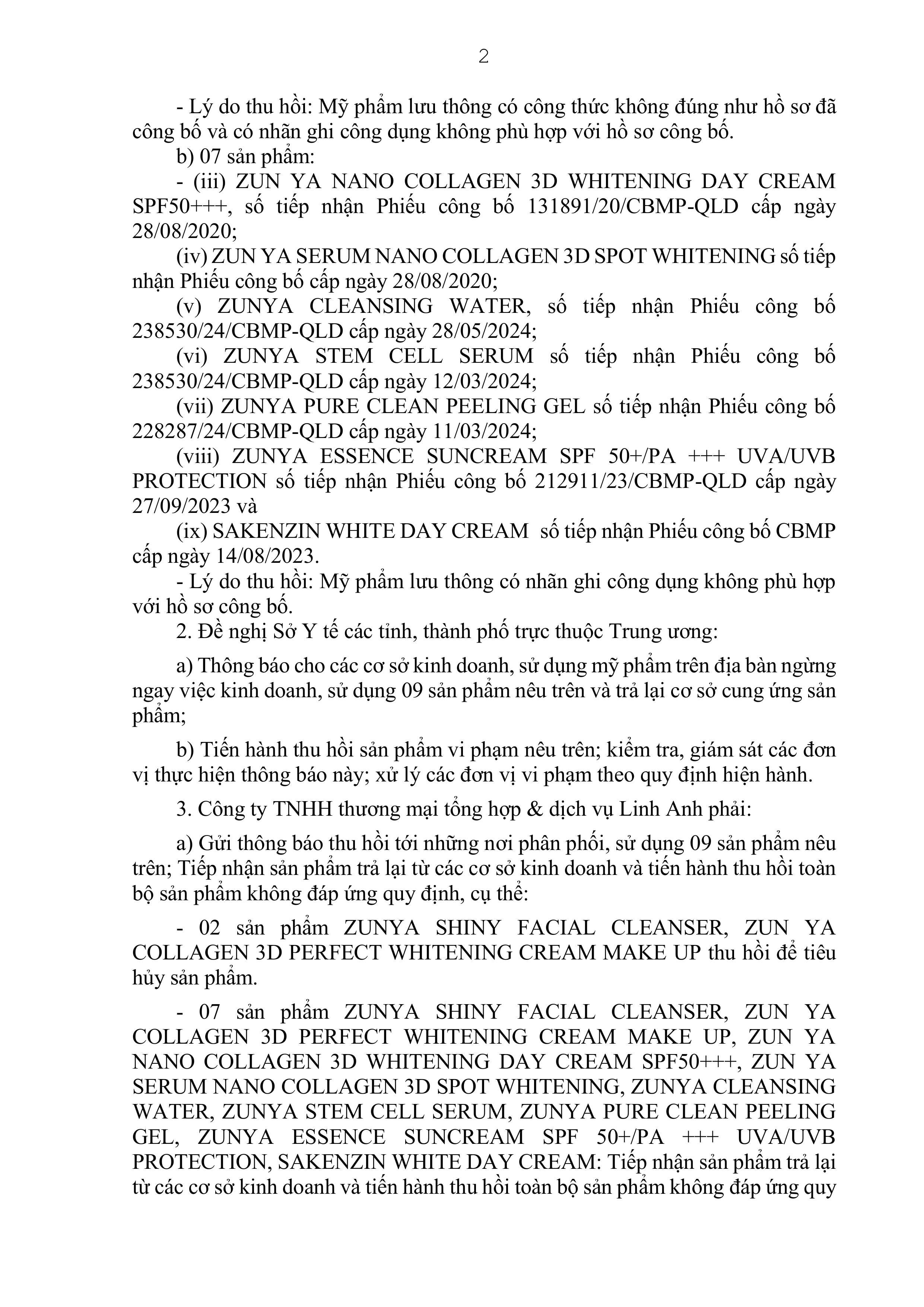 Đối với Công ty TNHH thương mại tổng hợp & dịch vụ Linh Anh phải: Gửi thông báo thu hồi tới những nơi phân phối, sử dụng 09 sản phẩm nêu trên; Tiếp nhận sản phẩm trả lại từ các cơ sở kinh doanh và tiến hành thu hồi toàn bộ sản phẩm không đáp ứng quy định, cụ thể: 02 sản phẩm ZUNYA SHINY FACIAL CLEANSER, ZUN YA COLLAGEN 3D PERFECT WHITENING CREAM MAKE UP thu hồi để tiêu hủy sản phẩm.