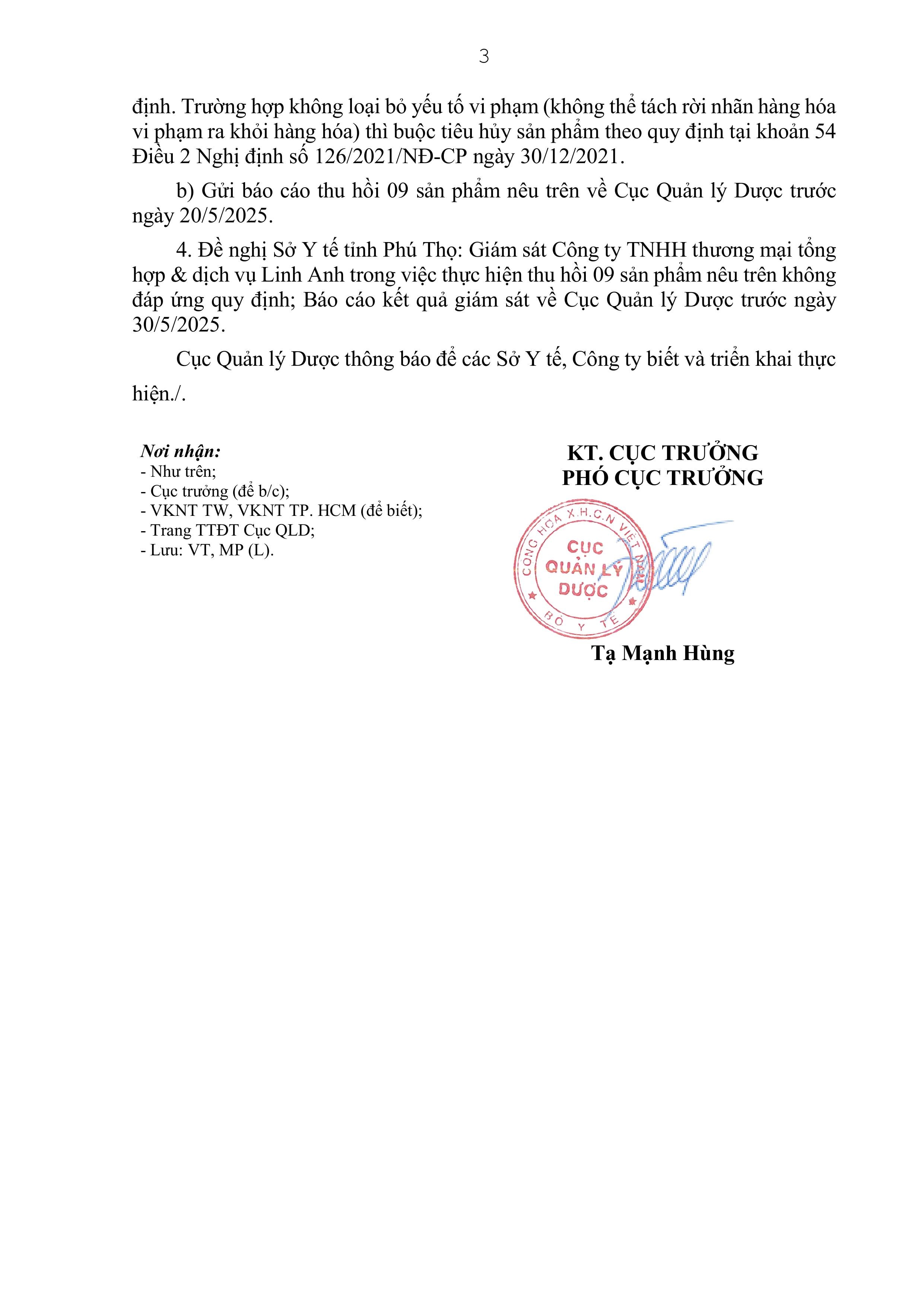 Bên cạnh đó, Cục Quản lý Dược (Bộ Y tế) đề nghị Sở Y tế tỉnh Phú Thọ: Giám sát Công ty TNHH thương mại tổng hợp & dịch vụ Linh Anh trong việc thực hiện thu hồi 09 sản phẩm nêu trên không đáp ứng quy định; Báo cáo kết quả giám sát về Cục Quản lý Dược trước ngày 30/5/2025.