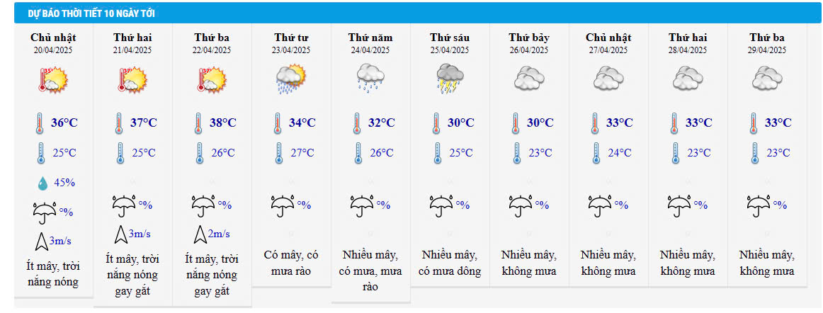 Bắt đầu từ thứ tư, ngày 23/4, thời tiết bắt đầu chuyển biến tích cực. Mây xuất hiện nhiều hơn và mưa rào rải rác có thể xảy ra vào chiều tối. Cảm giác oi bức phần nào được xua tan khi nhiệt độ giảm xuống mức 34 độ C, kèm theo không khí ẩm ướt hơn. Ngày 24/4 và 25/4, mưa có xu hướng lan rộng hơn trên địa bàn toàn tỉnh, trong đó có khả năng xuất hiện mưa dông vào chiều tối. Trời chuyển nhiều mây, nhiệt độ dao động từ 30 đến 32 độ C, tạo điều kiện thuận lợi cho cây trồng hồi phục sau đợt nắng kéo dài.