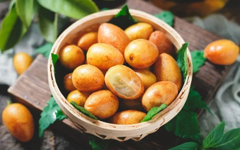 | Quả hồng bì hình bầu dục, dài khoảng 2–4cm, khi chín có màu vàng hoặc nâu vàng, vỏ mỏng, thịt quả mọng nước. |