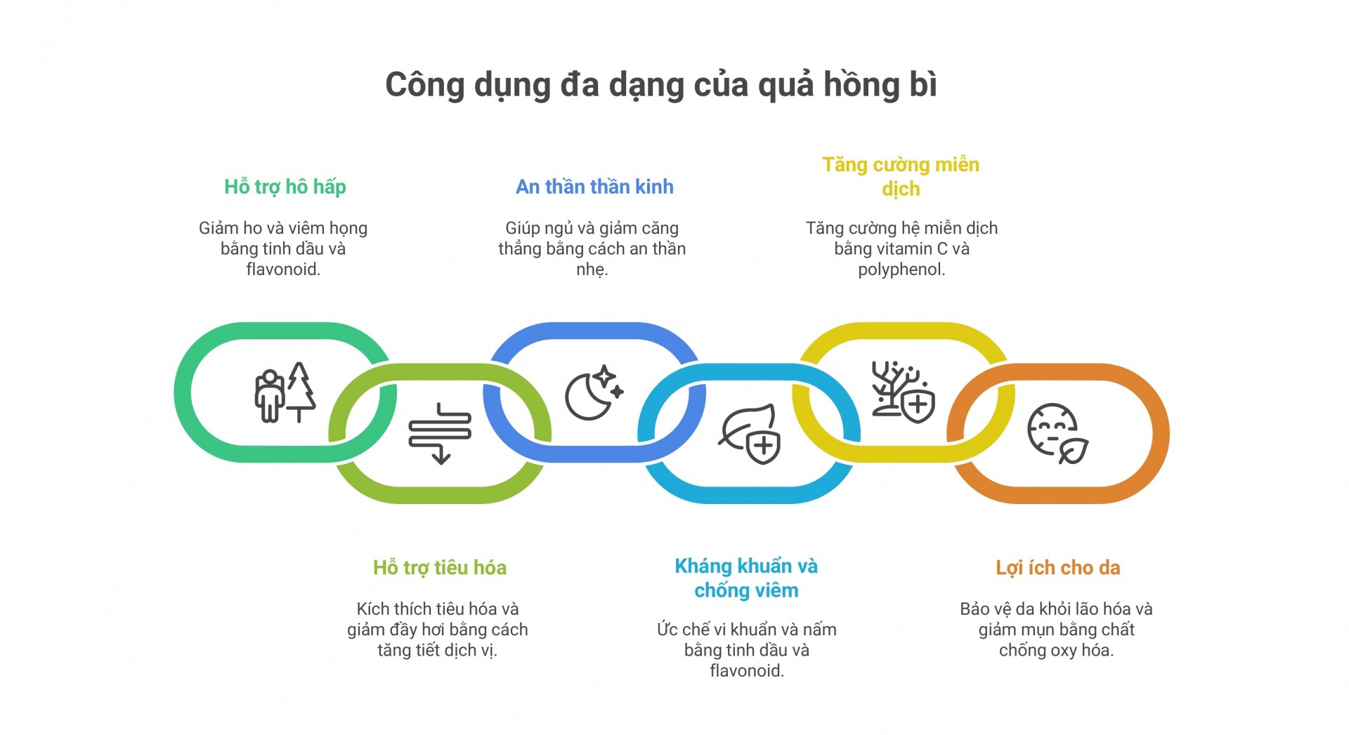 Chữa ho có đờm, viêm họng Nguyên liệu: Hồng bì chín 10–15 quả, đường phèn một ít. Cách dùng: Hồng bì rửa sạch, bỏ hạt, hấp cách thủy với đường phèn trong 15–20 phút. Ăn nóng hoặc ngậm từng quả, mỗi ngày 2–3 lần. Làm dịu cổ họng, giảm ho, long đờm tự nhiên. Trị chứng ăn uống không tiêu, đầy bụng Nguyên liệu: Vỏ quả hồng bì khô 10g, trần bì 6g, gừng khô 4g. Cách dùng: Sắc uống 1–2 lần/ngày. Hành khí, tiêu thực, kích thích tiêu hóa, giảm đầy hơi. Hỗ trợ điều trị mất ngủ Nguyên liệu: Hồng bì khô 15g, lá vông 10g, tâm sen 5g. Cách dùng: Sắc với 500ml nước, còn 200ml thì uống trước khi ngủ. Giúp an thần, giúp ngủ sâu và cải thiện chất lượng giấc ngủ. Tăng sức đề kháng, giải nhiệt cơ thể Nguyên liệu: Hồng bì tươi 100g, mật ong 2 muỗng cà phê. Cách dùng: Ép lấy nước hồng bì, hòa với mật ong, uống mỗi sáng. Bổ sung vitamin C tự nhiên, thanh lọc cơ thể, làm mát gan. |