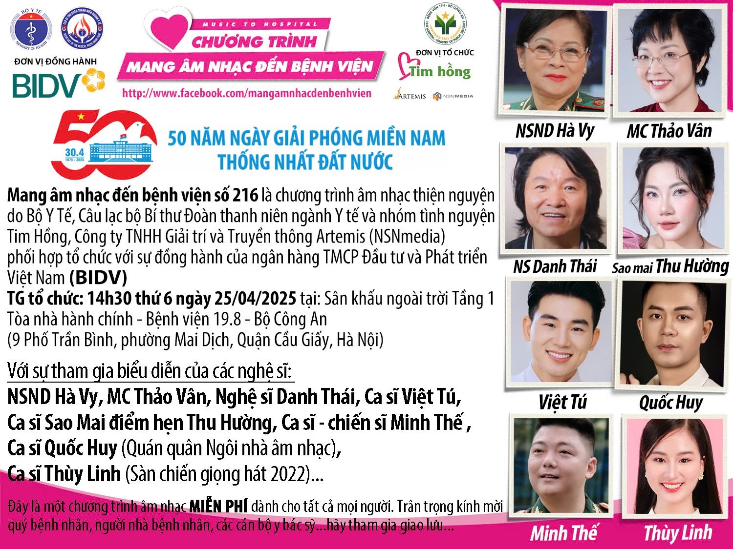 Với thông điệp đầy nhân văn: “Chúng tôi không biểu diễn, chúng tôi mang âm nhạc đến bệnh viện để đổi lấy những nụ cười hiếm hoi nơi này”, chương trình “Mang âm nhạc đến bệnh viện” số 216 hứa hẹn sẽ là một bản hòa tấu đầy cảm xúc, lan tỏa yêu thương và niềm tin vào cuộc sống – đặc biệt trong thời khắc ý nghĩa của đất nước.