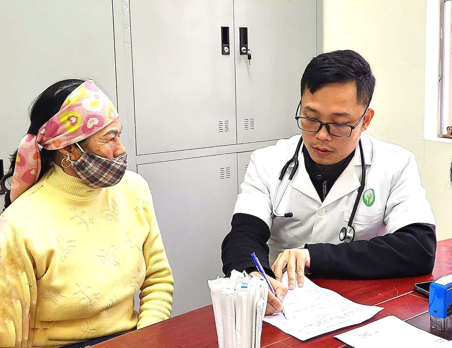 | ThS. Bs. Vũ Văn Minh (Khoa Nội tổng hợp, Đại học Phenikaa) thăm khám cho bà con. |