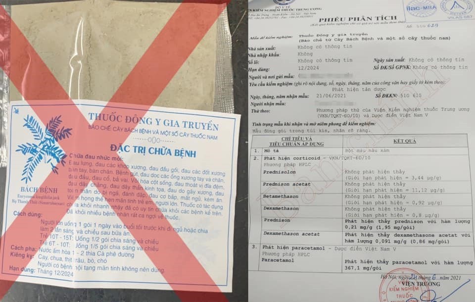Bệnh viện Trung ương Quân đội 108 từng tiếp nhận trường hợp bà P. (65 tuổi, Hà Nội) có tiền sử tăng huyết áp, suy tim, suy thận mạn, gút mạn. Suốt 2 năm liền, bà giấu gia đình mua một loại thuốc Đông y “chữa bách bệnh” về uống. Khi bà nhập viện, gói thuốc được gửi đến Viện Kiểm nghiệm thuốc Trung ương để kiểm tra, kết quả cho thấy có rất nhiều thành phần corticoid bên trong với hàm lượng cao.