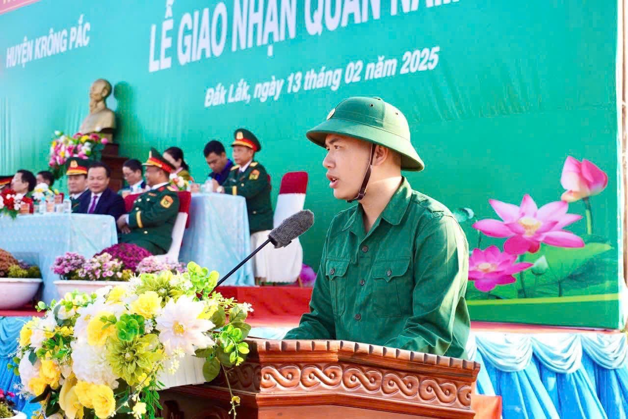 Thay mặt các tân binh nhập ngũ năm 2025, tân binh Nông Đức Nhật – xã Ea Yông xin hứa sẽ phát huy tinh thần sức trẻ đóng góp cho quê hương, đất nước, phấn đấu hoàn thành tốt mọi nhiệm vụ được giao trong khi tại ngũ, xứng đáng với truyền thống Krông Pắc anh hùng.