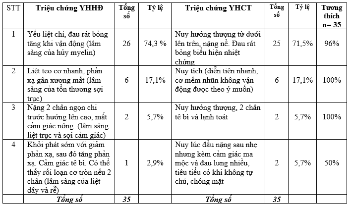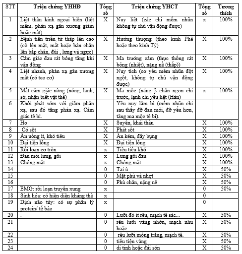 Trên cùng một bệnh nhân, triệu chứng chỉ có một dù cách gọi có khác nhau và cũng có một số triệu chứng mang tính đặc thù của mỗi nền y học (phản xạ gân xương, lưỡi mạch…). YHHĐ cho rằng sự đáp ứng miễn dịch sau bệnh cảnh đường hô hấp và tiêu hóa thành bệnh tự miễn hủy myelin thì YHCT cho là tà khí hóa độc tấn công kinh Phế và kinh Tỳ. Tính chất âm thăng từ hạ chú (vùng thấp) lên cao chính là tính liệt hướng thượng của YHHĐ. Cần khảo sát thể bệnh theo những tiêu chí tương đương.