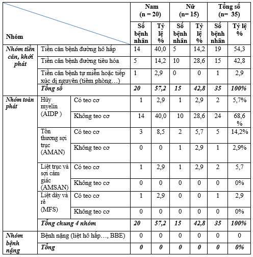 Nhận xét: Nam bị nhiều hơn nữ (ngành công an số lượng nam nhiều hơn nữ), phù hợp với dịch tễ. Không có sự khác biệt nhóm tiền căn đường hô hấp và đường tiêu hóa gây ra hội chứng Guillin- Barre, nhưng có sự khác biệt với nhóm tự miễn. Tỉ lệ đau rát bỏng do hủy myelin có sự khác biệt với tổng các nhóm bệnh khác mang ý nghĩa thông kê (p = 0,01). Triệu chứng teo cơ trong giai đoạn nghiên cứu có tần số không cao. Nhóm bệnh nhân nặng không nhập khoa nên không có số liệu so sánh.