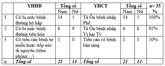 Kết quả: Khảo sát trên tần số lý thuyết thu được 3 nhóm bệnh cảnh tương thích (đường gây bệnh tự miễn, thời kỳ toàn phát và bệnh cảnh cấp cứu không có chỉ định điều trị YHCT), có độ tin cậy mang ý nghĩa thống kê p = 0,01. Trong thời kỳ toàn phát có 4 bệnh cảnh tương thích có độ tin cậy mang ý nghĩa thống kê p = 0,01.
