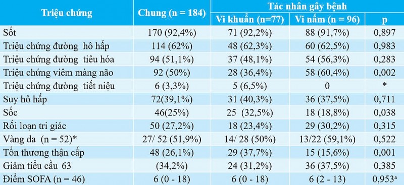 Sốt là triệu chứng thường gặp nhất, chiếm tỉ lệ 92,4%. Số ngày sốt trung vị là 10 ngày (1 - 90 ngày). Có sự khác biệt giữa thời gian sốt của các nhóm vi khuẩn và vi nấm: tác nhân vi khuẩn là 5 ngày (0 - 90 ngày), thấp hơn so với của vi nấm là 14 ngày (1 - 60 ngày) (phép kiểm Mann - Whitney, độ tin cậy 95%, p < 0,005). (Bảng 1)