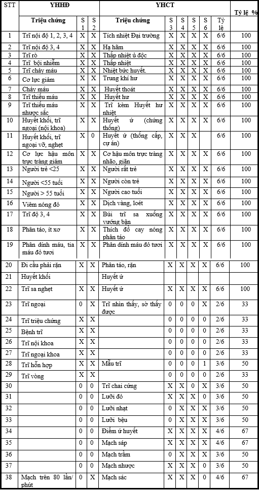 + Bước 1: Khảo sát tra cứu lý thuyết và xếp loại thể bệnh trĩ chỉ định ngoại khoa YHHĐ (triệu chứng) và triệu chứng chứng Hậu môn trĩ của YHCT. Sự tương thích đạt > 83% để đảm bảo tần suất xuất hiện nhiều nhất (> 5/6 tài liệu công nhận).