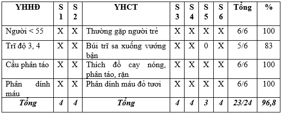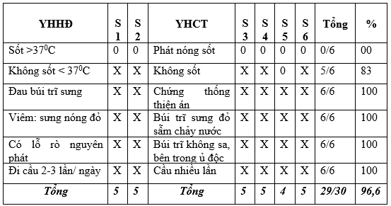Nhận xét: Tỉ lệ bệnh trĩ theo bệnh cảnh Huyết ứ chưa phân biệt rõ Thấp nhiệt Đại trường và Thấp nhiệt ủ độc. Trong tất cả mẫu không có bệnh nhân nào sốt, đều đau nhức thiện án, búi trĩ độ 3, 4 (hạ hãm) hoặc ủ độc không hạ hãm số liệu thấp, cần được nghiên cứu thêm. Thực ra triệu chứng sa sưng đỏ và triệu chứng lỗ rò nguyên phát là triệu chứng chỉ thống kê chọn một triệu chứng (cộng lại sẽ là 100%), tỉ lệ thực là 98,2 % (p= 0,05).