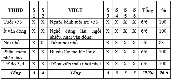 Các bệnh cảnh YHCT bệnh trĩ điều trị ngoại khoa có mói tương thích chặt chẽ mang ý nghĩa thống kê với cơ chế bệnh sinh của YHHĐ (p= 0,05):