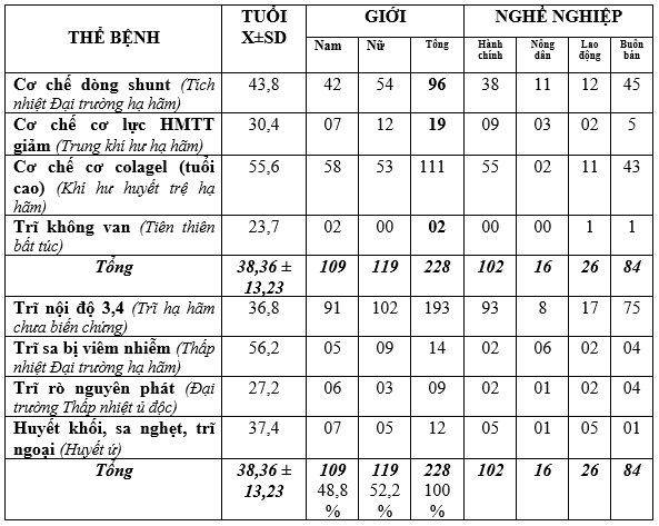Nhận xét: Tuổi trung bình X±SD = 55,6. Nữ mắc bệnh ít hơn nam. Tỉ lệ bệnh trĩ theo bệnh cảnh Khí hư huyết trệ có tương thích với nhóm tuổi cao có độ tin cậy mang ý nghĩa thống kê (p=0,05).