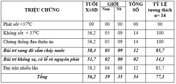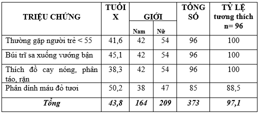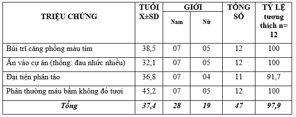 Nhận xét: Tuổi trung bình X±SD = 37,4. Nam mắc bệnh nhiều hơn nữ. Tỉ lệ bệnh trĩ theo bệnh cảnh Huyết ứ có sự tương đồng với trĩ huyết khối, sa nghẹt và trĩ ngoại. Triệu chứng thống cự án 100%. Sự tương đồng mang ý nghĩa thống kê (p= 0,05).